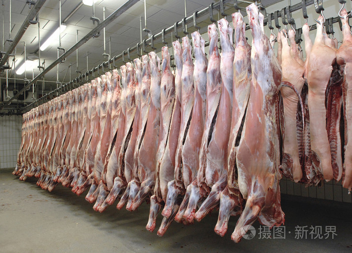 屠宰场的生产大厅 与猪钩在一起的牛的尸体 背景下工作的屠夫2019年4月24日基辅编辑类照片 图片包括有大厅 背包 183165146