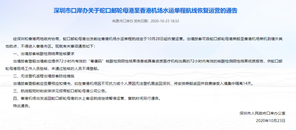 深圳蛇口码头至香港海天码头恢复快船转驳服务 null 民航资源网 carnoc com